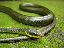 Família Colubridae: são áglifas ou opistóglifas, de tamanho variado, de pupila arrendondada ou elíptica. Não possuem fosseta loreal ou labial. A maioria de suas espécies são ovíparas. Podem ser noturnas ou diurnas, de hábitos aquáticos, terrícolas, subarborícolas, arborícolas e fossoriais. Alimentam-se de vertebrados e invertebrados. Como representantes, pode-se citar: cobra-cipó (Chironius spp) e falsas-corais (Oxyrhopus spp. e Erythrolamprus aesculapii).[22]