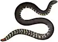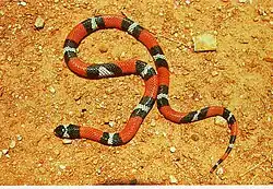 Família Elapidae: são peçonhentas, de tamanho pequeno a médio. Apresentam dentição proteróglifa e anéis coloridos pelo corpo. São ovíparas, apresentando hábitos fossoriais, criptozoicos, terrícola ou aquático. Ausência de fosseta loreal ou labial. Como exemplo, pode-se citar as corais-verdadeiras (Micrurus spp.).[22]