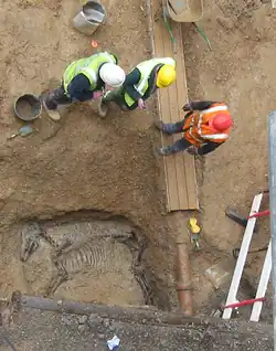 Escavação é a remoção de terra em torno de objetos ou fósseis soterrados.[1][2] Muito utilizado em áreas como a paleontologia e a arqueologia, a escavação arqueológica é um recurso para descobrir evidências sobre a evolução da história no mundo através dos vestígios que ficaram enterrados por conta da ação do tempo.[3][4] Ela é o procedimento pelo qual os arqueólogos definem, recuperam e registram restos culturais e biológicos encontrados no solo.[5] As atividades passadas deixam vestígios na forma de fundações domésticas, sepulturas, artefatos, ossos, sementes e muitos outros vestígios indicativos da experiência humana.[6][4]