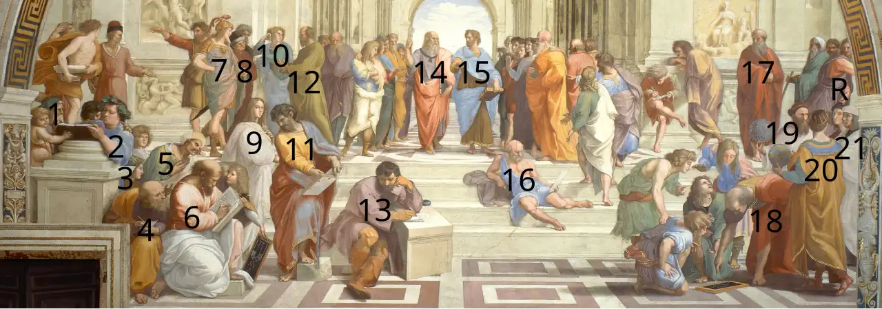 Luitpold Dussler conta entre aqueles que podem ser identificados com alguma certeza: Platão, Aristóteles, Sócrates, Pitágoras,[8] Euclides, Ptolomeu, Zoroastro, o próprio Rafael, Il Sodoma e Diógenes. Outras identificações ele assegura serem "mais ou menos especulativas".[9]