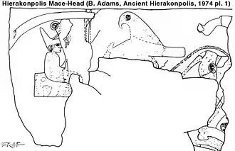 - ↑ F. J. Yurco, "Narmer: First King of Upper and Lower Egypt. A Reconsideration of his Palette and Macehead" in Journal of the Society for the Study of Egyptian Antiquities, No. 25, 1995, Figure 1