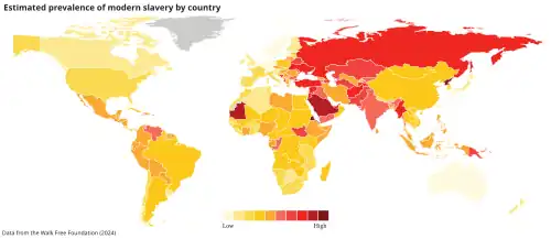 A escravidão continua em muitos países que a proibiram. Em alguns casos, a legislação que proíbe a escravidão foi somente feita pela pressão de outros países e da ONU, mas não representa a vontade do governo do respectivo país. Hoje em dia existem pelo menos 27 milhões de pessoas escravizadas no mundo.[54] A Organização Internacional do Trabalho (OIT) classifica em sua convenção de nº 29 do ano de 1930: "trabalho forçado ou obrigatório compreenderá todo trabalho ou serviço exigido de uma pessoa sob a ameaça de sanção e para o qual não se tenha oferecido espontaneamente".[55] Principalmente em países árabes e outros países muçulmanos existem ainda escravos tradicionais.[56]