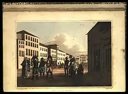 Ilustração de 1815 representando um capitão britânico horrorizado ao ver cristãos escravizados em Argel. |