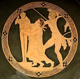 Mulheres como espólio de guerra: Ájax, o Jovem, tomando Cassandra, tondo de uma cílice em cerâmica vermelha do chamado Pintor de Kodros, c. 440-430 BC, Louvre