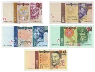 A última série de notas portuguesas permaneceu em vigência até à entrada do euro. Eram cinco notas dedicadas a importantes navegadores da época dos descobrimentos portugueses, com as seguintes características:[5]