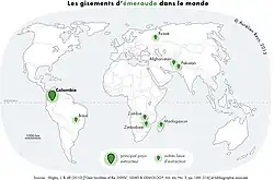As principais jazidas de esmeraldas são colombianas, mas podem ser encontradas também no Brasil — na Serra da Carnaíba na Bahia; em Itabira nas Minas Gerais; e em Campos Verdes em Goiás —, na Rússia, no Zimbábue e no Afeganistão.