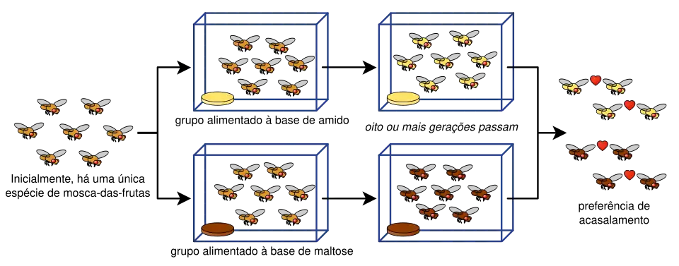 Diane Dodd também foi capaz de demonstrar especiação alopátrica por isolamento reprodutivo em Drosophila pseudoobscura após apenas oito gerações usando diferentes tipos de comida, amido e maltose.[28] A experiência de Dodd tem sido facilmente replicada por outros, incluindo outras espécies de moscas da fruta e alimentos.[29]
