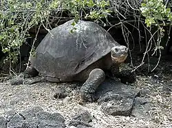 Outro exemplo de especiação alopátrica, embora em um estágio diferente dos tentilhões, é o das tartarugas gigantes de Galápagos.[1] Existem populações diferentes dessas tartarugas nas grandes ilhas do arquipélago, que provavelmente evoluíram a partir de um ancestral comum que se dispersou pelas ilhas. A divergência morfológica entre as populações observada por Darwin é clara e está relaciona com a adaptação aos ambientes diferenciados das ilhas. Em ilhas mais áridas, tartarugas evoluíram pescoços mais longos que permitem alcançar a vegetação de cactos mais altos que lhe servem de alimento. Já em ilhas mais úmidas, o formato do pescoço e casco são mais generalizados uma vez que se alimentam de vegetação rasteira. Apesar da clara divergência entre as populações de tartarugas gigantes, nenhumas das formas coexistem numa mesma ilha.