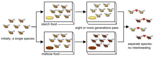 Estudos em laboratório e observações biogeográficas têm demonstrado evidências de que quando duas populações que estão geograficamente separadas estão evoluindo diferentemente (ou seja, genes diferentes estão sendo fixados), o isolamento reprodutivo também evolui entre essas populações, comprovando que o isolamento reprodutivo evolui como um subproduto da divergência entre as populações alopátricas. Um exemplo está no experimento de Dodd [5] com drosófilas, no qual se verificou o surgimento de isolamento pré-zigótico entre populações de Drosophila pseudoobscura mantidas em meios nutritivos diferenciados à base de amido ou maltose. Após várias gerações, as populações mantidas nesses meios nutritivos desenvolveram diferenças detectáveis nas enzimas digestivas como adaptações aos recursos diferenciados. E quando machos e fêmeas dessas populações foram colocados em contato, observou-se que houve preferência de acasalamento entre moscas de “amido” com parceiros de “amido” e entre moscas de “maltose” com parceiros de “maltose”, demonstrando que algum isolamento pré-zigótico havia evoluído. Dessa forma o isolamento reprodutivo não está sendo selecionado diretamente, mas sim surge como uma consequência no evento de divergência das populações dirigidas pela seleção para adaptações a diferentes dietas.