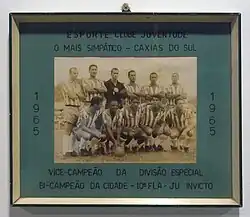 Em 1921 obteve em campo o campeonato estadual vencendo o Grêmio por 2 a 0, mas os pontos foram anulados judicialmente alegando-se que na inscrição oficial faltava o nome de um dos jogadores. Segundo matéria do jornal Pioneiro, o jogador Vicente Luizi estava de fato inscrito, mas seu sobrenome havia sido grafado Luiz. Junto com Celestino Bortogaray, Nicolau, Bado, Gabriel Sartori, Henrique Mengatto, Edemor Ferreira, Pepito, Martinez, Herminio Zanella e Rio Grande, essa esquadra foi uma das formações mais lendárias da história do clube, conquistando seis títulos do Citadino entre 1920 e 1926.[18][19][20] Em Caxias o anulamento da vitória estadual causara grande indignação, e além da perda do título a Federação havia imposto uma multa financeira ao clube e a suspensão de sua participação em outros jogos. Por isso, a assembleia havia decidido solicitar o desligamento da Federação. Em meados de 1922 o caso ainda gerava polêmica. A Federação não reconhecia seu erro, mas não aceitava o pedido de desligamento, forçando o Juventude a reiterá-lo.[21] Ainda em 1921 representantes do Juventude participaram da fundação da Liga Caxiense de Desportos.[22]