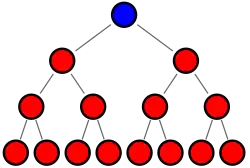 A progressão exponencial insustentável de um esquema de pirâmide clássico em que cada membro é obrigado a recrutar seis novas pessoas. Os 2,2 bilhões de pessoas na 12.ª camada seriam obrigados a recrutar mais 13,1 bilhões de pessoas para a 13.ª camada, para sustentar o esquema, mas isso é maior do que a população mundial