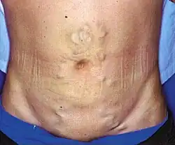 Coçar a erupção cutânea pode levar a uma infecção bacteriana secundária da pele, por isso é importante evitar coçar. Alguns tratamentos comuns para a coceira incluem creme corticosteroide, loção anti-coceira e aplicação de compressas frias a erupções cutâneas, tomar banho com sais de Epsom ou bicarbonato de sódio e, em casos de coceira intensa, cremes e loções fortes prescritos, anti-histamínicos orais também podem ajudar a aliviar a coceira.[14][19]