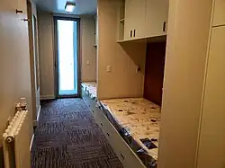 - Bloco Oeste: no andar superior, estão localizados 32 alojamentos, biblioteca, academia de ginástica e sala de vídeo/auditório, enquanto no andar inferior estão paióis de mantimentos e tanques de aguada e de combate a incêndio;[45]