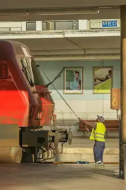 Lavagem das janelas de locomotiva de longo curso em Lisboa - Santa Apolónia.