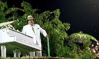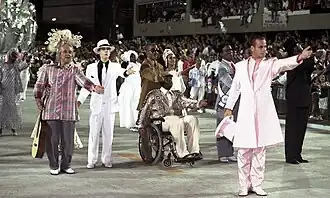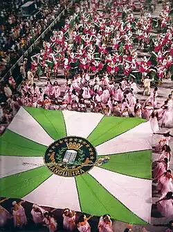 A Mangueira participou da primeira noite de desfiles, competindo com Beija-Flor, Mocidade Independente, Imperatriz, Vila Isabel, Estácio de Sá e Unidos da Ponte. A Mangueira foi a sétima, e última, agremiação a se apresentar, iniciando seu desfile com o dia claro, na manhã da terça-feira de carnaval. A escola realizou um desfile em homenagem ao compositor Braguinha.[68][69] O carnavalesco Max Lopes dividiu o desfile em três setores: "A Bela Época", sobre a infância de Braguinha; "Festa Junina", sobre as músicas do compositor para os festejos de meio de ano; e "Carnaval", sobre as marchinhas carnavalescas. Braguinha desfilou na primeira alegoria do desfile, sentado num banco ao lado de uma escultura de árvore com formato de mulher.[70] Ao final da apresentação, o público desceu das arquibancadas e se juntou aos componentes da escola, dando meia-volta na pista e iniciando um novo cortejo no sentido contrário, da Praça da Apoteose para a Avenida Presidente Vargas.[71][72] Em pesquisa realizada pelo IBOPE com o público no Sambódromo, a Mangueira foi eleita a melhor escola das duas noites.[73] A Mangueira foi a vencedora do Estandarte de Ouro, recebendo quatro prêmios: de melhor escola; melhor porta-bandeira para Mocinha; passista masculino para Índio; e destaque feminino para Maria Helena.[74][75] A Mangueira foi a campeã do desfile de segunda-feira, conquistando seu 13.º título no carnaval, quebrando o jejum de dez anos sem conquistas. Dos vinte julgadores do carnaval, apenas dois não deram nota máxima (dez) à escola. A Mangueira perdeu apenas dois pontos: um em Conjunto e outro em Comissão de Frente; vencendo com sete pontos de vantagem sobre a vice-campeã, Mocidade.[76][77] No sábado seguinte ao carnaval, a Mangueira participou do Supercampeonato, também realizado no sambódromo. A escola foi a décima, e última, a desfilar, iniciando sua apresentação por volta das nove horas da manhã de domingo, sob forte sol. A escola foi saudada pelo público com gritos de "campeã" e repetiu a meia-volta na pista realizada no desfile de segunda-feira.[78][79] Confirmando o favoritismo, a Mangueira se sagrou supercampeã, conquistando seu 14.º título no carnaval. Na avaliação dos jurados, a escola perdeu apenas um ponto, no quesito Bateria, vencendo com dois pontos de vantagem sobre a vice-campeã, Portela. Seguindo o regulamento do concurso, os quesitos Alegorias e Adereços, Enredo e Fantasias não foram avaliados.[80][81] Em julho de 1984, a Mangueira foi uma das agremiações fundadoras da Liga Independente das Escolas de Samba do Rio de Janeiro (LIESA). Dirigentes de dez das principais escolas de samba do Rio decidiram se desligar da AESCRJ e fundar a nova entidade com o objetivo de administrar o desfile do grupo principal, negociar diretamente a subvenção com Prefeitura e os direitos de imagem com as emissoras de televisão, além de controlar e repartir o lucro dos desfiles com as agremiações.[82][83][84]