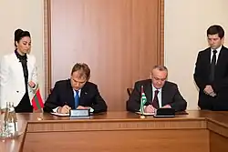 O presidente da Abecásia, Alexander Ankvab, com o presidente da Transnístria, Yevgeny Shevchuk, em 2013. Tanto a Abecásia como a Transnístria foram descritas como estados fantoches da Rússia.