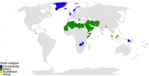 | Islamismo | Afeganistão Arábia Saudita Argélia Bahrein Bangladesh Brunei Catar Comores Djibouti Egito Emirados Árabes Unidos Iêmen Irã Iraque Jordânia Kuwait Líbia Malásia Maldivas Marrocos Mauritânia Omã Paquistão Somália Somalilândia Sudão Tunísia |