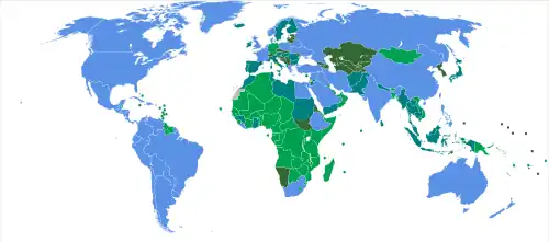Mapa dos Estados membros da ONU e seus territórios dependentes como tal reconhecidos pela ONU. Regiões excluídas: Antártida (regulado pelo Tratado da Antártida), Cidade do Vaticano (a Santa Sé é um observador das Nações Unidas), territórios palestinos (Palestina, representada pela Autoridade Nacional Palestina, é um observador das Nações Unidas), e Saara Ocidental (território em disputa entre Marrocos e a Frente Polisário). Territórios dos Estados não reconhecidos pela ONU não são excluídos devido à posição da ONU de que eles são parte de algum Estado membro da ONU. A ONU considera Taiwan como parte da República Popular da China "os únicos representantes legais da China" na ONU.