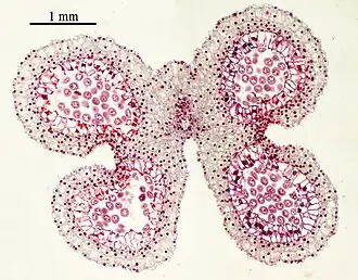 Secção transversal de um estame de Lilium, com 4 lóculos rodeados por células do tapetum.