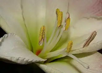 Flor de Amarillys com estames com anteras evidentes, carregadas de pólen.
