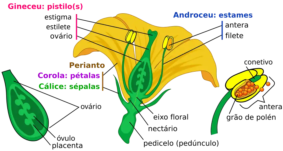 • Antera — situada na parte superior do estame, geralmente com formato globuloso, contém os microsporângios que produzem os esporos haplóides, denominados grãos de pólen (gâmetas masculinos);