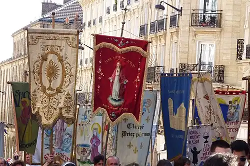 Os estandartes processionais das instituições e comunidades religiosas católicas são tipicamente armados em verga, sendo portanto suspensos verticalmente de uma vareta horizontal que forma uma cruz com a haste vertical. O seu pano é geralmente rematado com franjas, sendo frequentemente farpado, com duas ou mais pontas das quais pendem borlas. Por norma, são feitos de tecidos ricos (seda ou cetim) sendo as inscrições e outros motivos decorativos bordados no pano a fio de ouro ou de prata. No centro do anverso do pano está pintada a imagem do seu orago ou ocasionalmente o emblema da instituição. Por vezes, no reverso do pano está colocado um outro emblema. Como é comum na vexilologia, não existe uma designação padronizada para estes estandartes, os quais são frequentemente referidos simplesmente como "bandeiras" ou por outras designações. Os estandartes armados em verga são frequentemente referidos como "pendões" ou ocasionalmente como "vexilos" (uma vez que são semelhantes e descendentes diretos dos antigos vexilos romanos).
