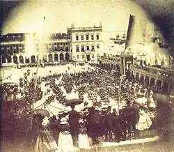 Em 18 de maio de 1858, salvas de artilharia ao amanhecer comunicaram oficialmente à população de Lisboa a realização das cerimônias do casamento do rei D. Pedro V. A corveta Bartolomeu Dias, que havia transportado a noiva, encontrava-se fundeada em frente à Praça do Comércio. Às nove horas e doze minutos foi anunciada a saída do monarca do Paço das Necessidades, e pouco antes das dez horas o cortejo real chegou à Praça do Comércio, conforme o programa publicado na folha oficial.[16]