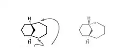 Estereoisômeros também surgem quando dois anéis compartilham um vínculo comum. No isômero cis ambas os ramificações do anel fundido estão no mesmo lado e no isômero trans, estão em lados opostos. Como por exemplo, o composto formado pela junção de dois anéis do ciclohexano, a decalina, apresenta isomeria cis-trans; na cis-decalina, os dois átomos de hidrogênios, ligados aos átomos da cabeça de ponte, estão no mesmo lado do anel, enquanto que na trans-decalina, eles estão em lados opostos [6].