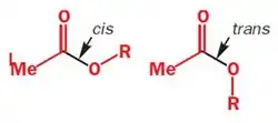 O oxigênio da carbonila em ambas as configurações do estes, Z (cis) ou E(trans) tem um par de elétrons orientado antiperiplanar com a ligação C – OR, e uma interação n – σ* poderá existir porque o par de elétrons do orbital pode overlap com o orbital antiligante σ* da ligação C – OR. Em outras palavras, este efeito eletrônico secundário (efeito anomérico) pode dar uma característica de “tripla ligação” conforme ilustrado na figura abaixo para o grupo carbonil (O=C-OR).