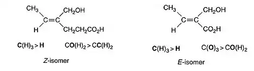 Quando a prioridade for atribuída, o isômero que apresentar as maiores prioridades no mesmo lado é chamado isômero Z. Se os grupos com maiores prioridades estiverem em lados opostos, o isômero é denominado E. As letras são de origem alemã, E representa a palavra entgegen, que significa “opostos” e Z refere-se a zusammen, que quer dizer “juntos”.[4]