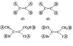 Entretanto, quando há mais de dois substituintes no alceno, essa notação se torna ambígua. Existe a notação E-Z que é capaz de ser aplicada a todos os sistemas, sem que as designações gerem dúvidas.[6]