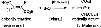 Nessa reação a molécula é hidratada pela enzima quiral criando um produto com atividade óptica, pois forma seletivamente um único enantiômero.[20]