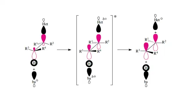 Essa graduação dos valores de KE2 se torna facilmente compreendida observando a figura abaixo e percebendo o seguinte: no estado de transição mais estável de uma eliminação E2 a quebra da ligação αC...H e a quebra da ligação βC....H são orientadas paralelo. Isto ocorre porque a hibridização do αC e βC muda de sp3 para sp2 no estado de transição. Como resultado, orbitais atômicos 2pz estão sendo formados como αC e αC e eles aumentam efetivamente a estabilidade do overlap da ligação π. Em outras palavras, ligações coplanares αC...H e βC....H estabilizam o estado de transição de uma reação de eliminação E2 através de uma interação π.