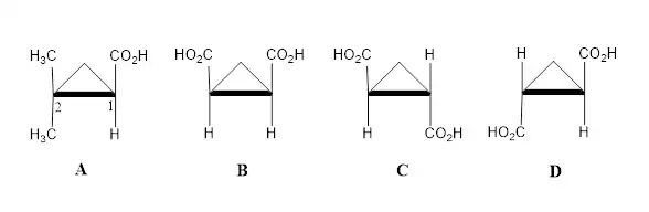 O ácido 2,2-dimetilciclopropanocarboxílico (A) tem um centro quiral em C(1) e existe como um par de enantiômeros e seu estereoisomerismo não se difere de moléculas quirais acíclicas. O mesmo ocorre no ácido ciclopropano-1,2-dicarboxílico que tem três estereoisômeros: uma forma meso (B) e um par de enantiômeros (C, D) diastereoméricos com a forma meso [8].