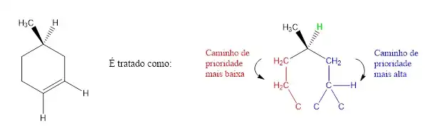 O Sistema de notação R-S de CIP pode ser naturalmente utilizada em compostos cíclicos [8], [9]. Compostos nos quais um centro de quiralidade faz parte de um anel são tratados de forma semelhante ao de moléculas acíclicas. Por exemplo, para determinar se a configuração do (+)-4-metilciclohexeno é R ou S, são tratados caminhos horário e anti-horário ao redor do anel como se eles fossem grupos independentes [9].