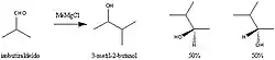 Entretanto, nas nitrilas não há, sob qualquer hipótese, proquiralidade, pois a reação de adição nucleofílica conduz a um produto no qual o carbono está hibridizado sp².[18]