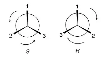 Para realizar a leitura posiciona-se o grupo de menor prioridade para trás, afastando-se do leitor, no momento da leitura. Lê-se os grupos em ordem decrescente de prioridade.[1] Caso a ordem de prioridade girar no sentido horário, o isômero será designado R. Se ao seguir do grupo de maior prioridade para o de menor, a direção da rotação for anti-horária, denominamos a molécula como S.[4]