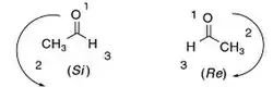 Exceto pelo formaldeído, as faces do grupo carbonila em aldeídos são proquirais. Nas cetonas, a proquiralidade acontece quando os dois substituintes ligados ao carbono carbonílico são diferentes. Se essas condições forem satisfeitas e não houver quiralidade presente nos substituintes R¹ e R², o grupo carbonila é enantiotópico, ou seja, numa reação de adição de um nucleófilo aquiral, uma mistura equimolar de enantiômeros se forma desde que a espécie nucleofílica seja diferente dos substituintes já ligados ao carbono carbonílico (ver esquema abaixo).[18]
