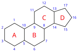 Todos os esteroides apresentam em comum a estrutura química denominada ciclopentanoperidrofenantreno: um núcleo cíclico similar, semelhante ao núcleo do fenantreno (anéis A, B e C), que são ligados a um anel ciclopentano (D). As posições dos carbonos nos núcleos esteroides são numeradas. É importante imaginar que nas fórmulas estruturais dos esteroides um anel hexagonal simples indica um anel de 6 carbonos completamente saturado com todas as valências satisfeitas com ligações de hidrogênio, a menos que se mostre outra maneira, isto é, ele não é um anel benzênico. Todas as duplas ligações se mostram como tais. As cadeias laterais de metila apresentam-se como ligações livres simples no outro extremo (metílico). Estas ocorrem, tipicamente nas posições 10 e 13 (constituindo um átomo de C19 e C18). Uma cadeia lateral, na posição 17, é visual (como no colesterol). Quando o composto contém um ou mais grupos de hidroxila e nenhum grupo carbonila ou carboxila, ele é um esterol e a seu nome é acrescido o sufixo -ol.