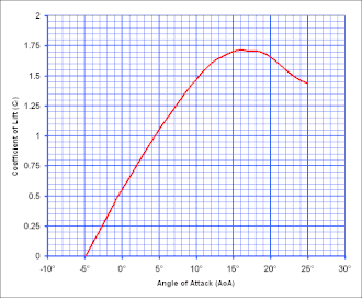 Curva típica do Coeficiente de Sustenção vs. ângulo de Ataque para um perfil assimétrico.Note que neste perfil o estol ocorre a 16 graus de ângulo de ataque