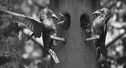- ↑ Stark, Mike (7 de setembro de 2009). «Shock and Caw: Pesky Starlings Still Overwhelm». NBC News. Consultado em 19 de março de 2019. Cópia arquivada em 25 de outubro de 2022