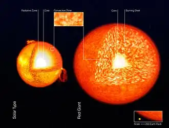 Uma estrela se torna gigante depois que todo o hidrogênio disponível para fusão em seu núcleo se esgota e, como resultado, deixa a sequência principal.[2] O comportamento de uma estrela pós-sequência principal depende em grande parte de sua massa.