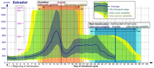 - ↑ Häggström, Mikael (2014). «Reference ranges for estradiol, progesterone, luteinizing hormone and follicle-stimulating hormone during the menstrual cycle». WikiJournal of Medicine. 1 (1). ISSN 2002-4436. doi:10.15347/wjm/2014.001