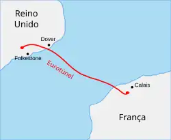 ![]() Mapa indicando o trajeto do Eurotúnel sob o Canal da Mancha | |