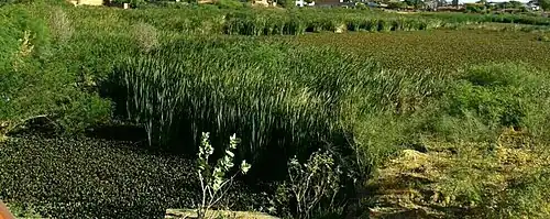 - Ocupações por agricultura: A retirada da mata ciliar para a introdução da agricultura e pastagens é um dos principais problemas de degradação da qualidade da água. Percebe-se que com a redução da vegetação ciliar, o ciclo hidrológico é interrompido e a infiltração é prejudicada, como consequência, aumenta-se o escoamento superficial tornando o corpo d`água vulnerável à drenagem de poluentes. O agricultor, com o intuito de suprir a ausência de nutrientes das matas ciliares removidas, além também de tentar maximizar a produção de alimentos, adiciona quantidades elevadas de fertilizantes artificiais, como o NPK (com elevados teores de nitrogênio, fósforo e potássio), que podem escoar para dentro dos corpos d`água durante os períodos de chuva.[8]