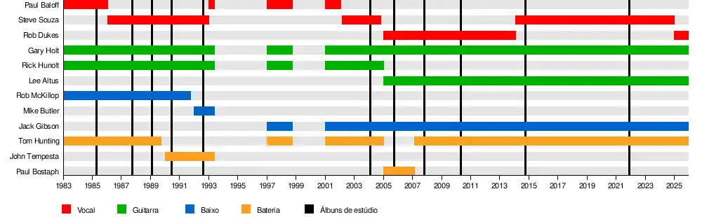 | Ex-integrantes | Kirk Hammett Tim Agnello Keith Stewart Carlton Melson Jeff Andrews Paul Baloff Mike Maung Evan McCaskey Rob McKillop Rick Hunolt John Tempesta Michael Butler Steve Souza Paul Bostaph |