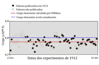 O valor obtido nos experimentos iniciais realizados por Millikan e Fletcher em 1911 foi de e = 4,891×10–10 Fr = 1,631×10–19 C,[12] que corresponde a uma diferença de 4,8% do valor atualmente aceito. Com as melhorias técnicas introduzidas por Millikan posteriormente, obteve-se, em 1913, um valor de e = 4,774 ± 0,009×10–10 Fr = 1,592 ± 0,003×10–19 C,[18] apenas 0,62% menor que o valor atual de e = 1,602 176 565 (35)×10−19 C.[19]