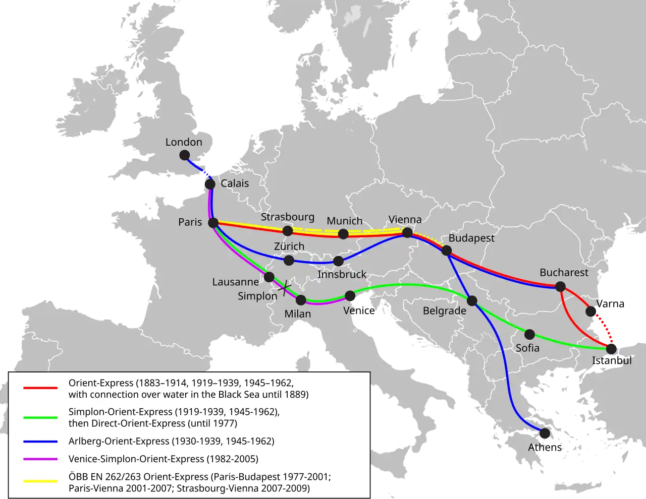| Expresso do Oriente 1883-1914 (com conexão sobre o mar Negro até 1889) 1919-1939 1945-1962 | |||||||||||||||||||||||||||||||||||||||||||||||||||||||||||||||||||||||||||||||||||||||||||||||||||||||||||||||||||||||||||||||||||||||||||||||||||||||||||||||||||||||||||||||||||||||||||||||||||||||||||||||||||||||||||||||||||||||||||||||||||||||||||||||||||||||||||||||||||||||||||||||||||||||||||||||||||||||||||||||||||||||||||||||||||||||||||||||||||||||||||||||||||||||||||||||||||||||||||||||||||||||||||||||||||||||||||||||||||||||||||||||||||||||||||||||||||||||||||||||||||||||||||||||||||||||||||||||||||||||||||||||||||||||||||||||||||||||||||||||||||||||||||||||||||||||||||||||||||||||||||||||||||||||||||||||||||||||||||||||||||||||||||||||||||||||||||||||||||||||||||||