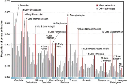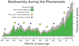 Desde a explosão Cambriana, cinco grandes extinções em massa superaram significativamente a taxa de extinção de fundo. A mais recente e mais conhecida, o evento de extinção Cretáceo-Paleógeno, que ocorreu milhões de anos atrás, foi uma extinção em massa em grande escala de espécies animais e vegetais em um período geológico curto.[71] Além das cinco grandes extinções em massa Fanerozoicas, existem várias menores, e a atual extinção em massa causada pela atividade humana às vezes é chamada de sexta extinção em massa.[72]