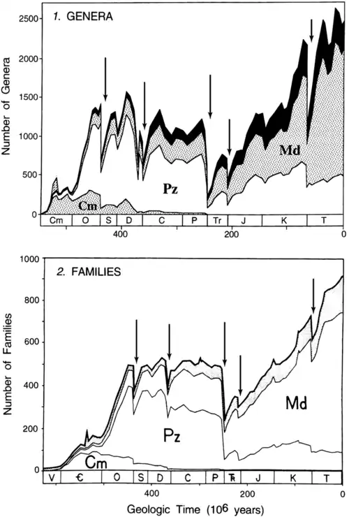 Ao mesmo tempo, Sepkoski começou a elaborar um compêndio de gêneros de animais marinhos, o que permitiria aos pesquisadores explorar a extinção em uma resolução taxonômica mais detalhada. Ele começou a publicar resultados preliminares desse estudo em andamento já em 1986, em um artigo que identificou 29 intervalos de extinção de destaque.[50] Em 1992, ele também atualizou seu compêndio de famílias de 1982, encontrando mudanças mínimas na curva de diversidade, apesar de uma década de novos dados.[41][53] Em 1996, Sepkoski publicou outro artigo que acompanhava a extinção de gêneros marinhos (em termos de perda líquida de diversidade) por estágio, de maneira semelhante ao seu trabalho anterior sobre extinções de famílias. O artigo filtrou sua amostra de três maneiras: todos os gêneros (o tamanho total da amostra não filtrada), gêneros de múltiplos intervalos (apenas aqueles encontrados em mais de um estágio) e gêneros "bem preservados" (excluindo aqueles de grupos com registros fósseis ruins ou pouco estudados). As tendências de diversidade nas famílias de animais marinhos também foram revisadas com base em sua atualização de 1992.[43]